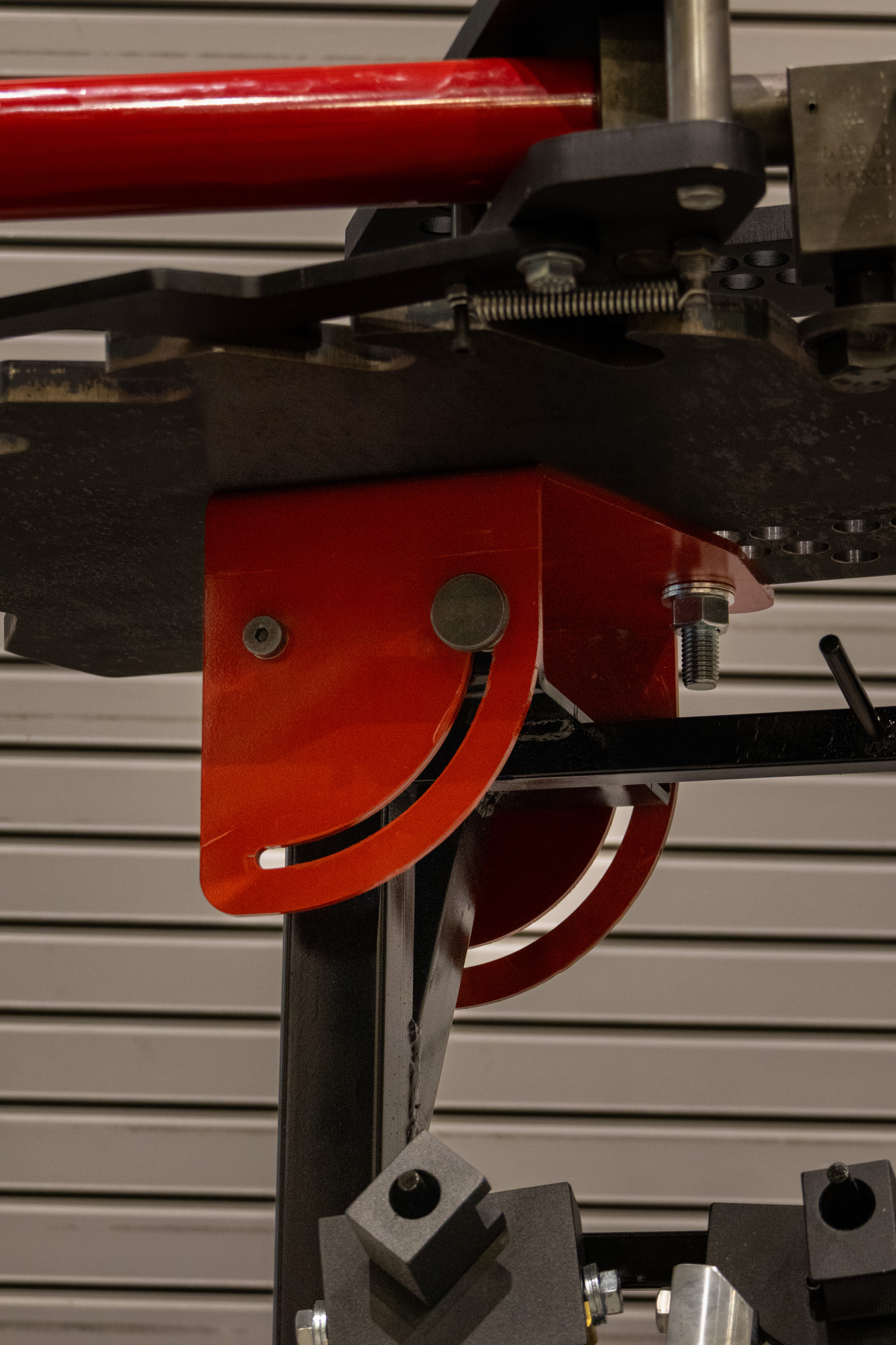 All that was left after the tooling rack was to add the hinge mechanism that I designed in Fusion 360 and had manufactured by SendCutSend. Unfoutunatly, the company bent one of the peices backward (my own faut) so the bender ended up tilting the wrong way, but still useable. I also added a scew adjustment to the top off the frame to take the weight of the bender off of the pivot.