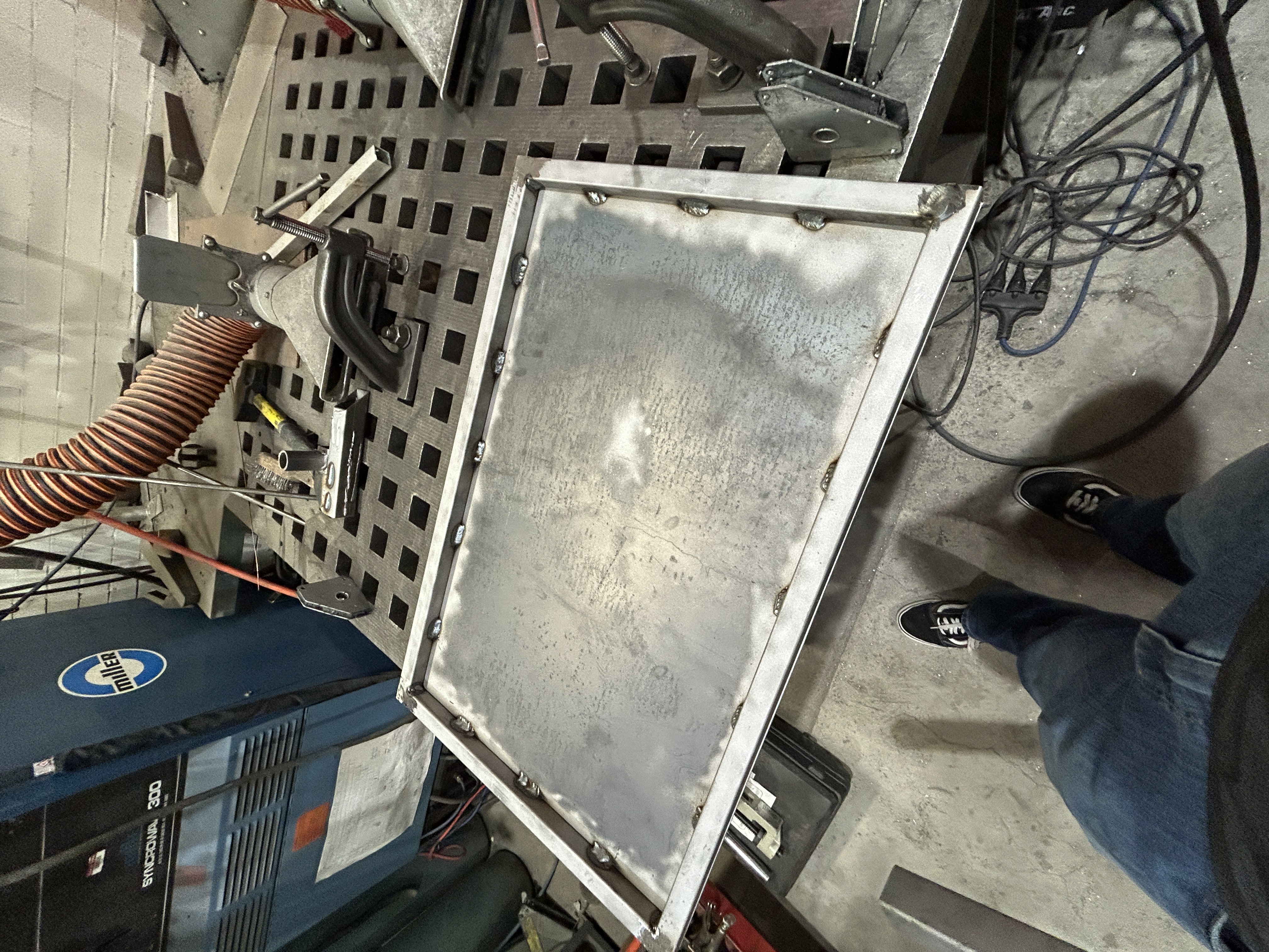 After finishing the tube frame, I cut a sheet steel down to size using a metal circular saw and stitch welded the sheet to the frame.