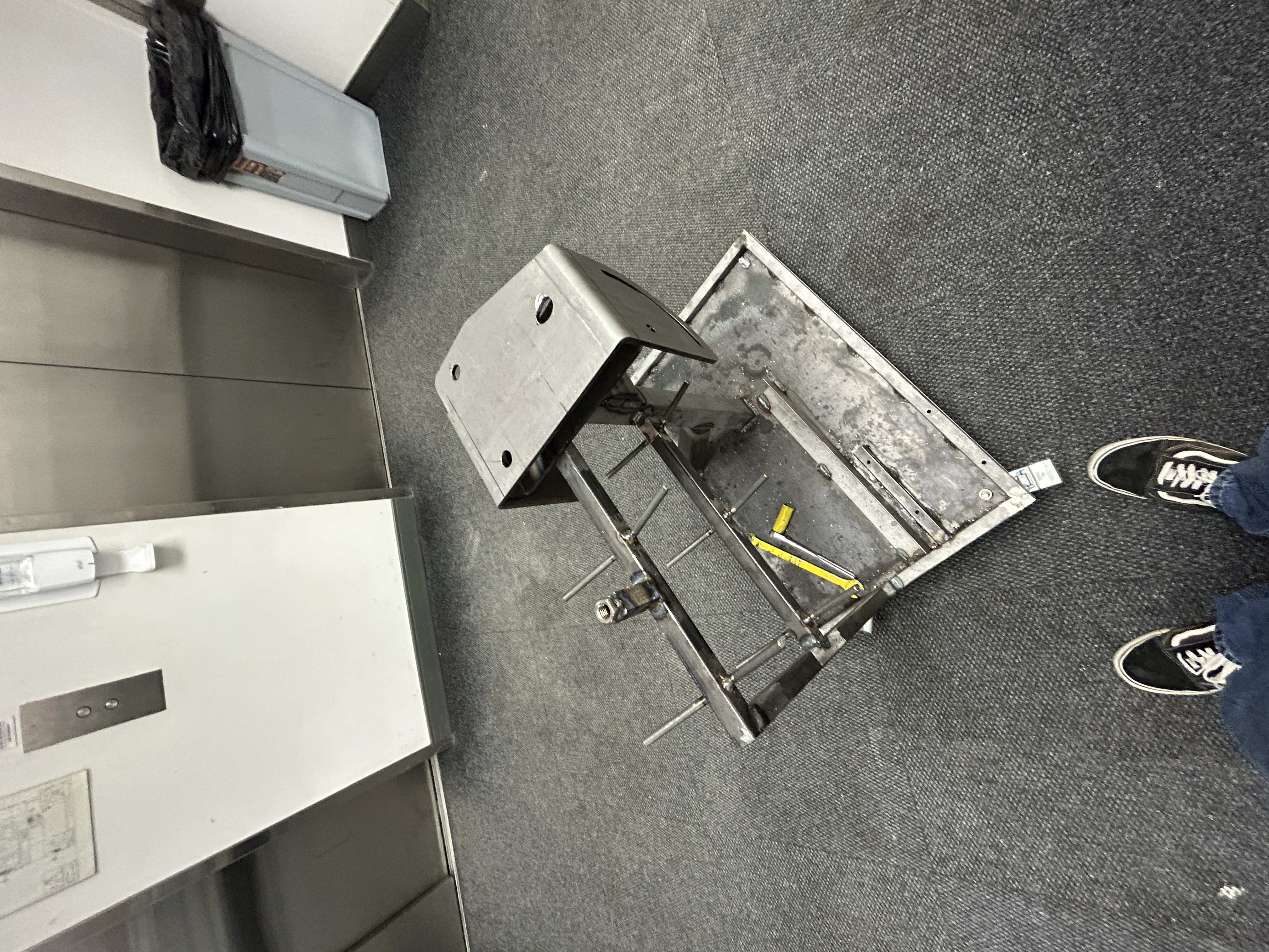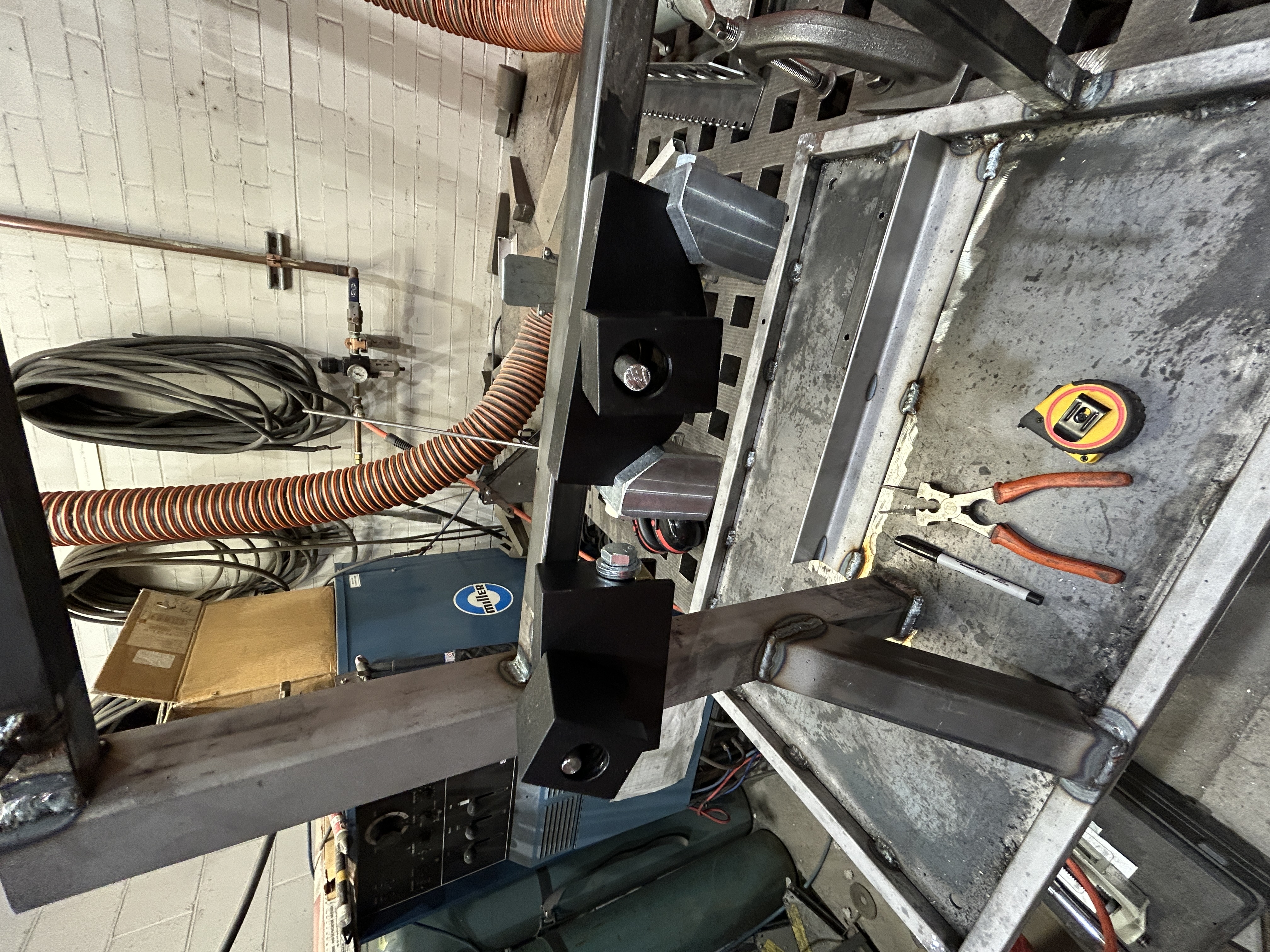 All that was left after the tooling rack was to add the hinge mechanism that I designed in Fusion 360 and had manufactured by SendCutSend. Unfoutunatly, the company bent one of the peices backward (my own faut) so the bender ended up tilting the wrong way, but still useable. I also added a scew adjustment to the top off the frame to take the weight of the bender off of the pivot.